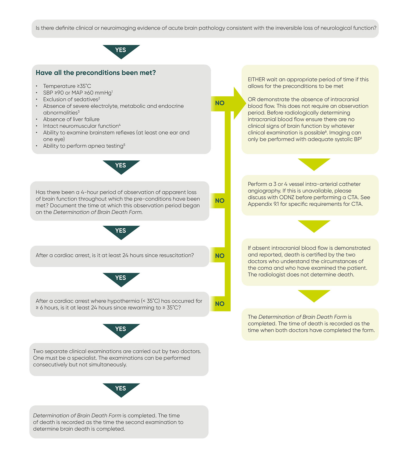 ODNZ requires the determination of brain death to be in accordance with the standards defined in the ANZICS Statement. For details of preconditions, observation periods, clinical examination, alternatives to clinical examination, and determination of brain death in infants and children, see Section 3.2.
